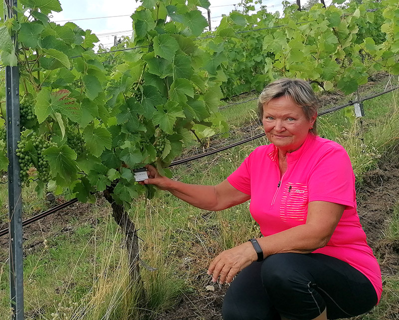 beim Besuch ihres Müller-Thurgau-Weinstocks im Juli 2024 mit der Weinstocknummer