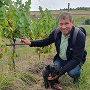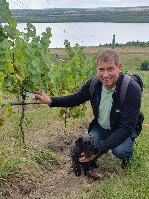 beim Besuch seines Traminer-Weinstocks mit der Weinstocknummer